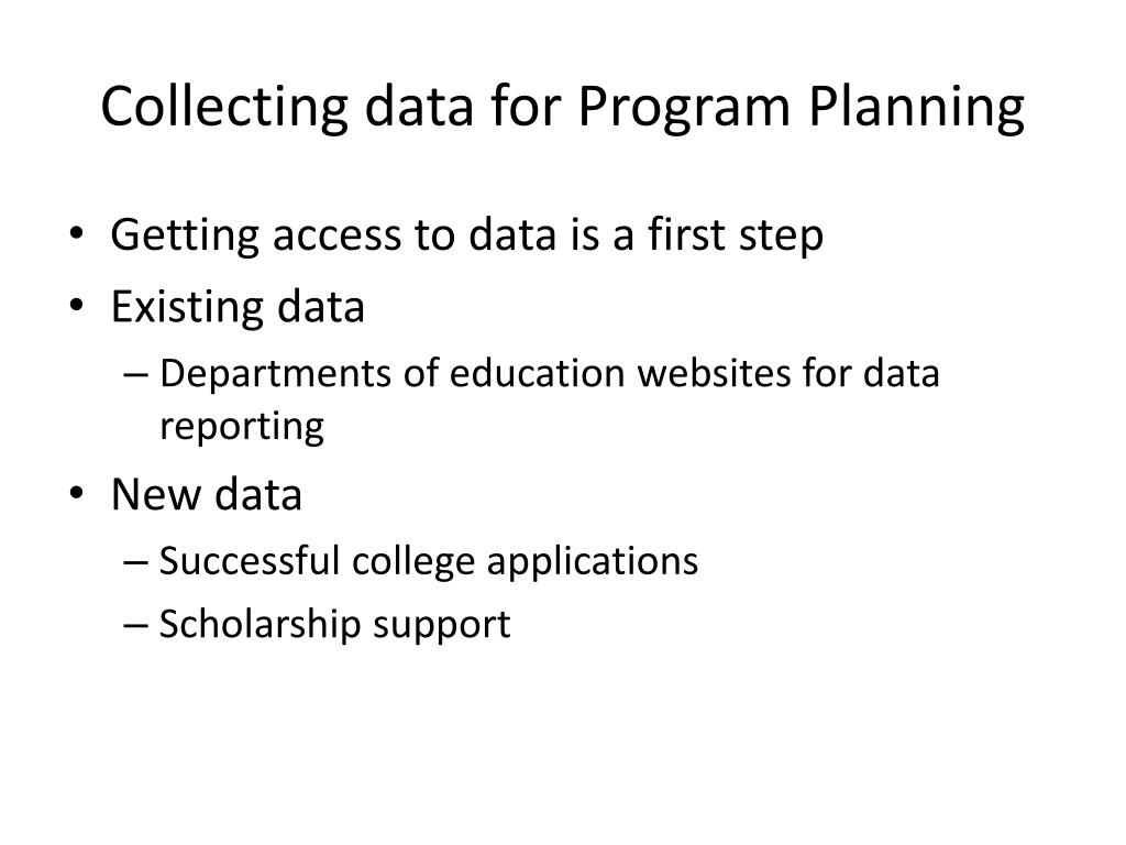 Collecting data for Program Planning • Getting access to data is a first step • Existing data • Departments of education websites for data reporting • New data • Successful college applications • Scholarship support