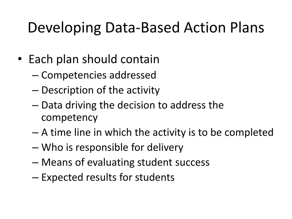Developing Data-Based Action Plans • Each plan should contain • Competencies addressed • Description of the activity • Data driving the decision to address the competency • A time line in which the activity is to be completed • Who is responsible for delivery • Means of evaluating student success • Expected results for students