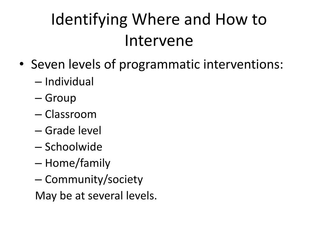 Identifying Where and How to Intervene • Seven levels of programmatic interventions: • Individual • Group • Classroom • Grade level • Schoolwide • Home/family • Community/society May be at several levels.