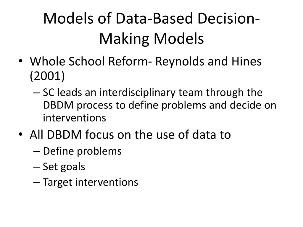 Models of Data-Based Decision-Making Models • Whole School Reform- Reynolds and Hines (2001) • SC leads an interdisciplinary team through the DBDM process to define problems and decide on interventions • All DBDM focus on the use of data to • Define problems • Set goals • Target interventions