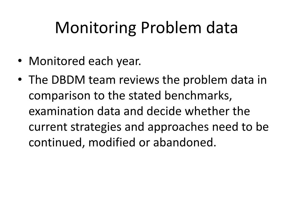 Monitoring Problem data • Monitored each year. • The DBDM team reviews the problem data in comparison to the stated benchmarks, examination data and decide whether the current strategies and approaches need to be continued, modified or abandoned.