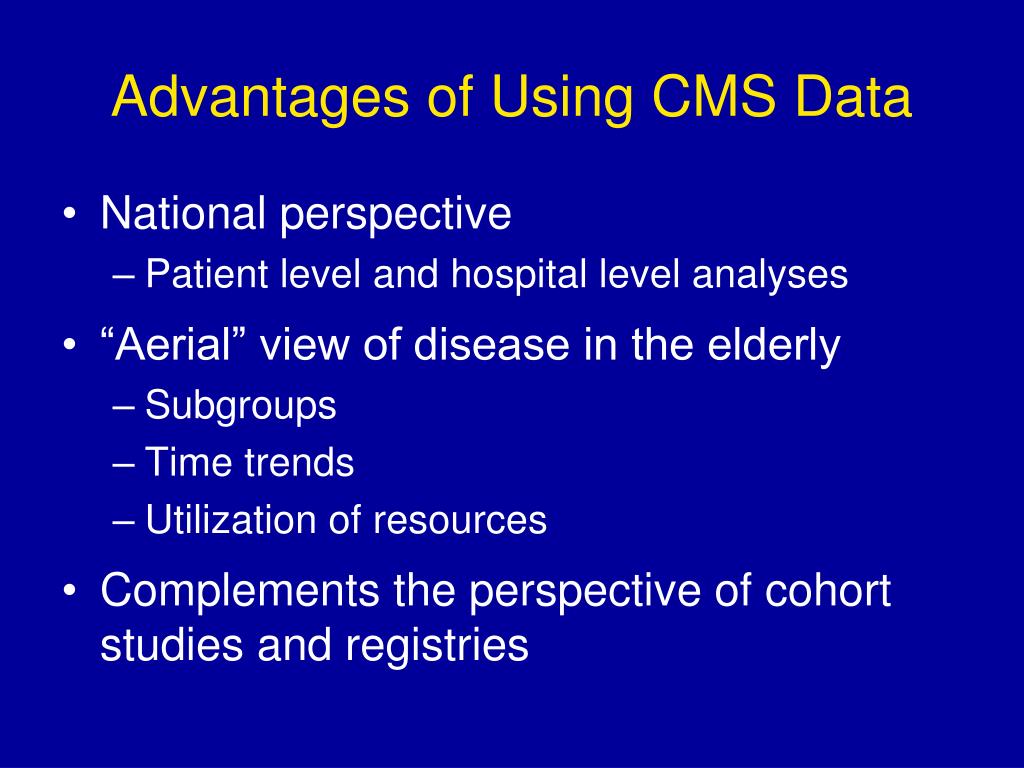 Advantages of Using CMS Data • National perspective • Patient level and hospital level analyses • “Aerial” view of disease in the elderly • Subgroups • Time trends • Utilization of resources • Complements the perspective of cohort studies and registries