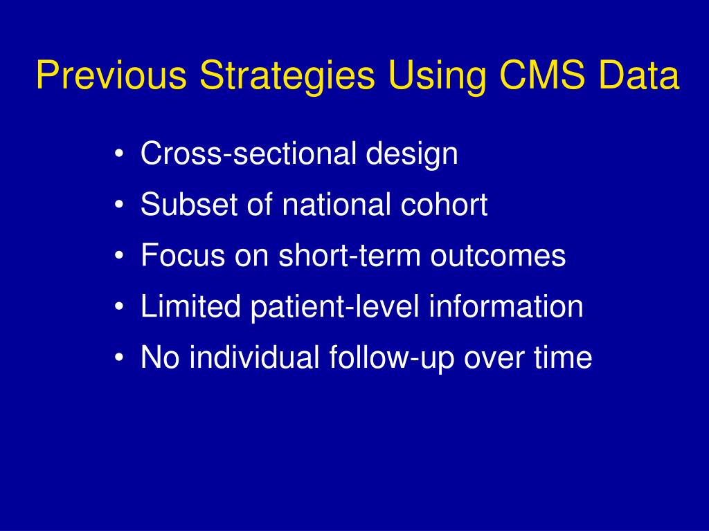 Previous Strategies Using CMS Data • Cross-sectional design • Subset of national cohort • Focus on short-term outcomes • Limited patient-level information • No individual follow-up over time