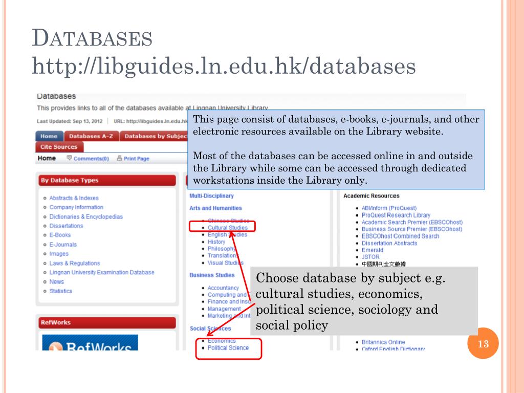Databaseshttp://libguides.ln.edu.hk/databases This page consist of databases, e-books, e-journals, and other electronic resources available on the Library website. Most of the databases can be accessed online in and outside the Library while some can be accessed through dedicated workstations inside the Library only. Choose database by subject e.g. cultural studies, economics, political science, sociology and social policy