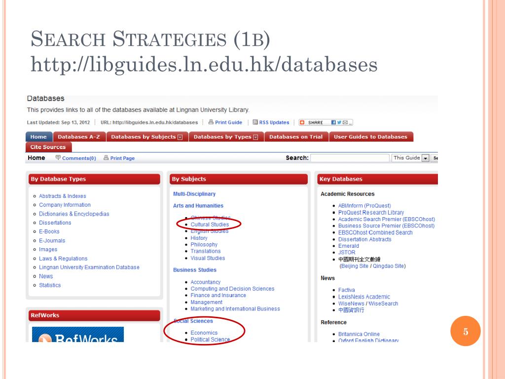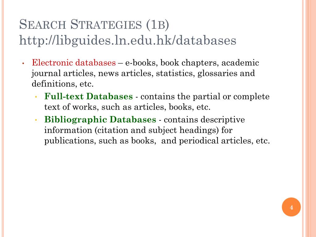 Search Strategies (1b)http://libguides.ln.edu.hk/databases • Electronic databases – e-books, book chapters, academic journal articles, news articles, statistics, glossaries and definitions, etc. • Full-text Databases- contains the partial or complete text of works, such as articles, books, etc. • Bibliographic Databases - contains descriptive information (citation and subject headings) for publications, such as books, and periodical articles, etc.