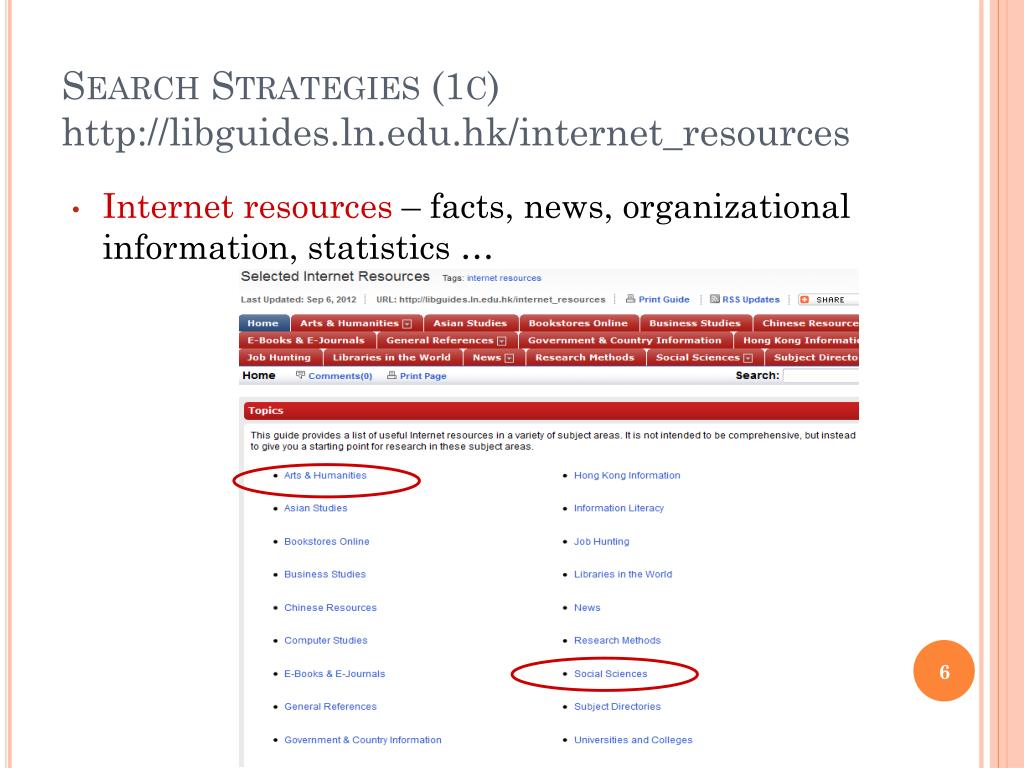Search Strategies (1c)http://libguides.ln.edu.hk/internet_resources • Internet resources – facts, news, organizational information, statistics …