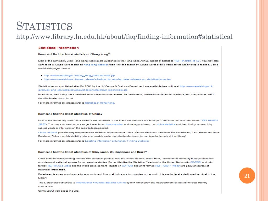Statisticshttp://www.library.ln.edu.hk/about/faq/finding-information#statisticalStatisticshttp://www.library.ln.edu.hk/about/faq/finding-information#statistical