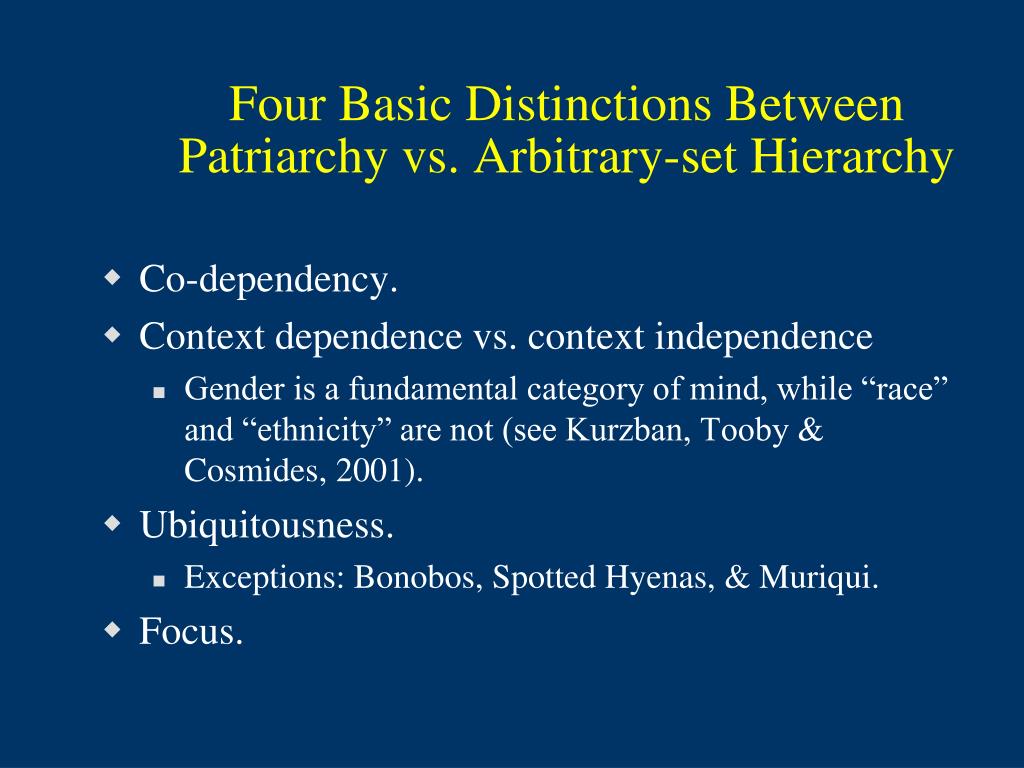 Four Basic Distinctions Between Patriarchy vs. Arbitrary-set Hierarchy • Co-dependency. • Context dependence vs. context independence • Gender is a fundamental category of mind, while “race” and “ethnicity” are not (see Kurzban, Tooby & Cosmides, 2001). • Ubiquitousness. • Exceptions: Bonobos, Spotted Hyenas, & Muriqui. • Focus.