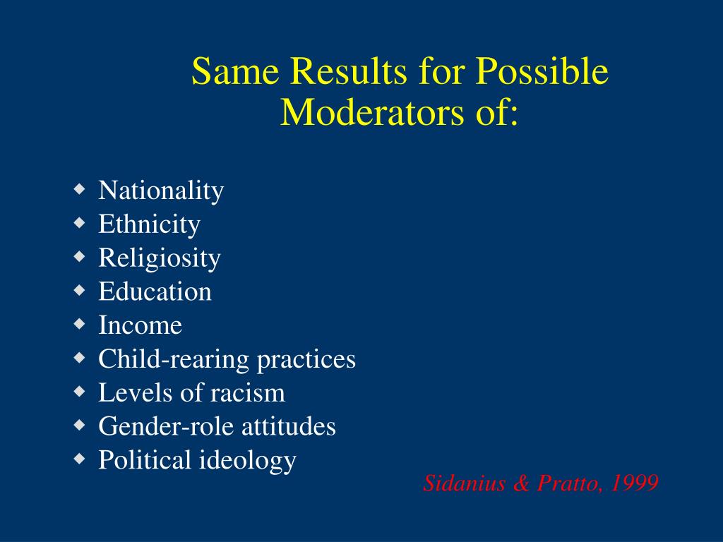 Same Results for Possible Moderators of: • Nationality • Ethnicity • Religiosity • Education • Income • Child-rearing practices • Levels of racism • Gender-role attitudes • Political ideology Sidanius & Pratto, 1999