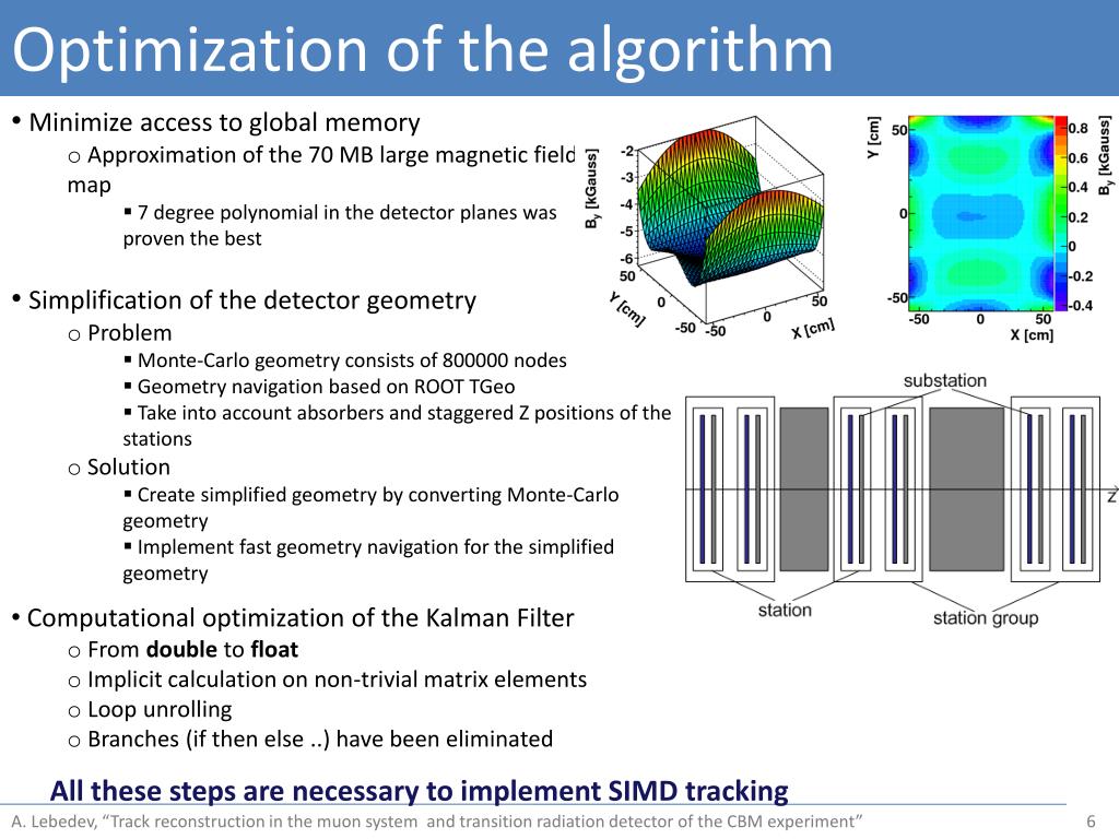 Optimization of the algorithm • Minimize access to global memory • Approximation of the 70 MB large magnetic field map • 7 degree polynomial in the detector planes was proven the best • Simplification of the detector geometry • Problem • Monte-Carlo geometry consists of 800000 nodes • Geometry navigation based on ROOT TGeo • Take into account absorbers and staggered Z positions of the stations • Solution • Create simplified geometry by converting Monte-Carlo geometry • Implement fast geometry navigation for the simplified geometry • Computational optimization of the Kalman Filter • From double to float • Implicit calculation on non-trivial matrix elements • Loop unrolling • Branches (if then else ..) have been eliminated All these steps are necessary to implement SIMD tracking