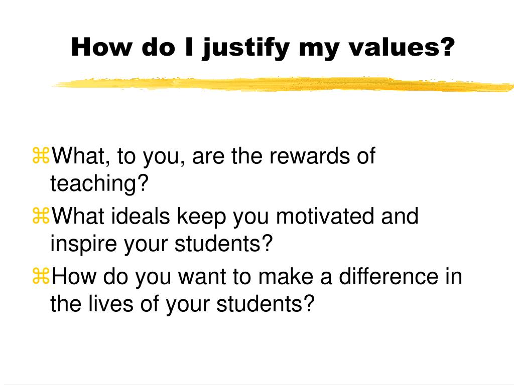 How do I justify my values? • What, to you, are the rewards of teaching? • What ideals keep you motivated and inspire your students? • How do you want to make a difference in the lives of your students?