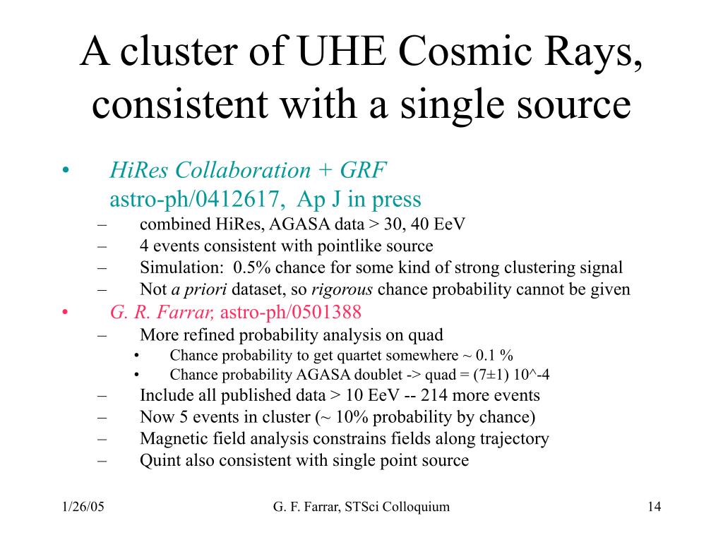 Theories of accelerationHow does nature do a trillion times better job than best human technology (Large Hadron Collider)? • Cataclysmic event like gamma ray burst (GRB) -- collapse of massive star to black hole (?) • Long, gradual acceleration in large scale magnetic shocks taking millions of years • Jets in AGNs (accreting supermassive BH) • Decay of invisible, super-heavy particle created in early moments of Big Bang G. F. Farrar, STSci Colloquium
