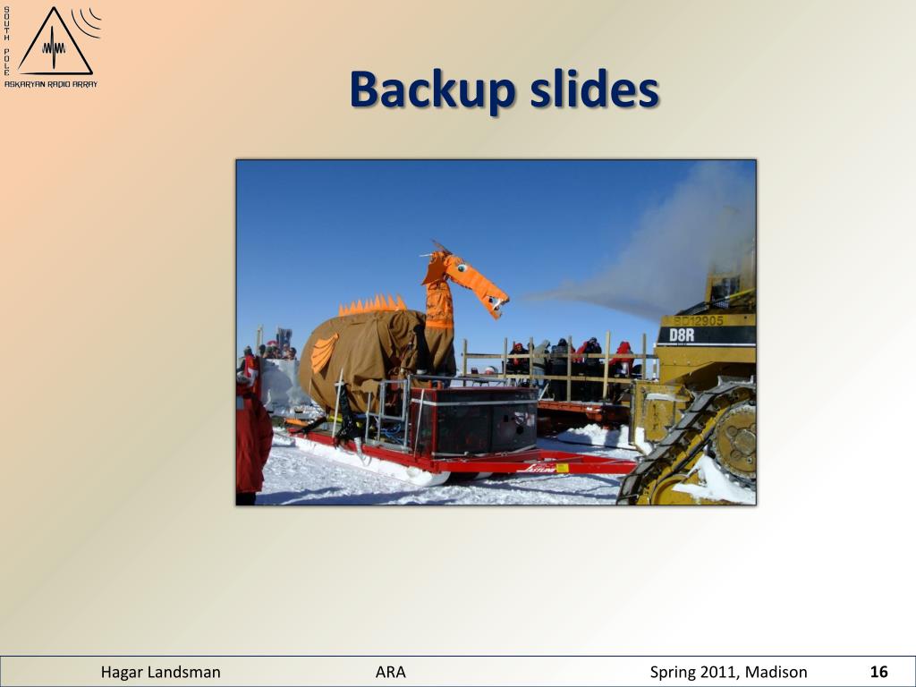 This season’s on ice achievementsDrill Test 2 : Hot water drill • Carried on three sleds pulled by tractor • 0.5 – 1m per minute ( 200m in ~1/2 day ) • 6” hole • Wet hole- must be pumped out or electronic made watertight • Deepest hole drilled ~160 m Drill in Operation ARA hot water drill sleds Hagar Landsman IceCube RF extension and ARA APS 2011, Anaheim,CA