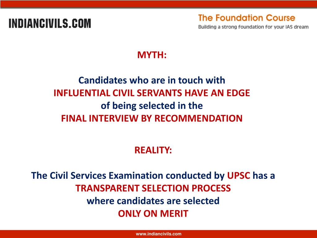 MYTH:Candidates who are in touch with INFLUENTIAL CIVIL SERVANTS HAVE AN EDGE of being selected in the FINAL INTERVIEW BY RECOMMENDATION REALITY: The Civil Services Examination conducted by UPSC has a TRANSPARENT SELECTION PROCESS where candidates are selected ONLY ON MERIT
