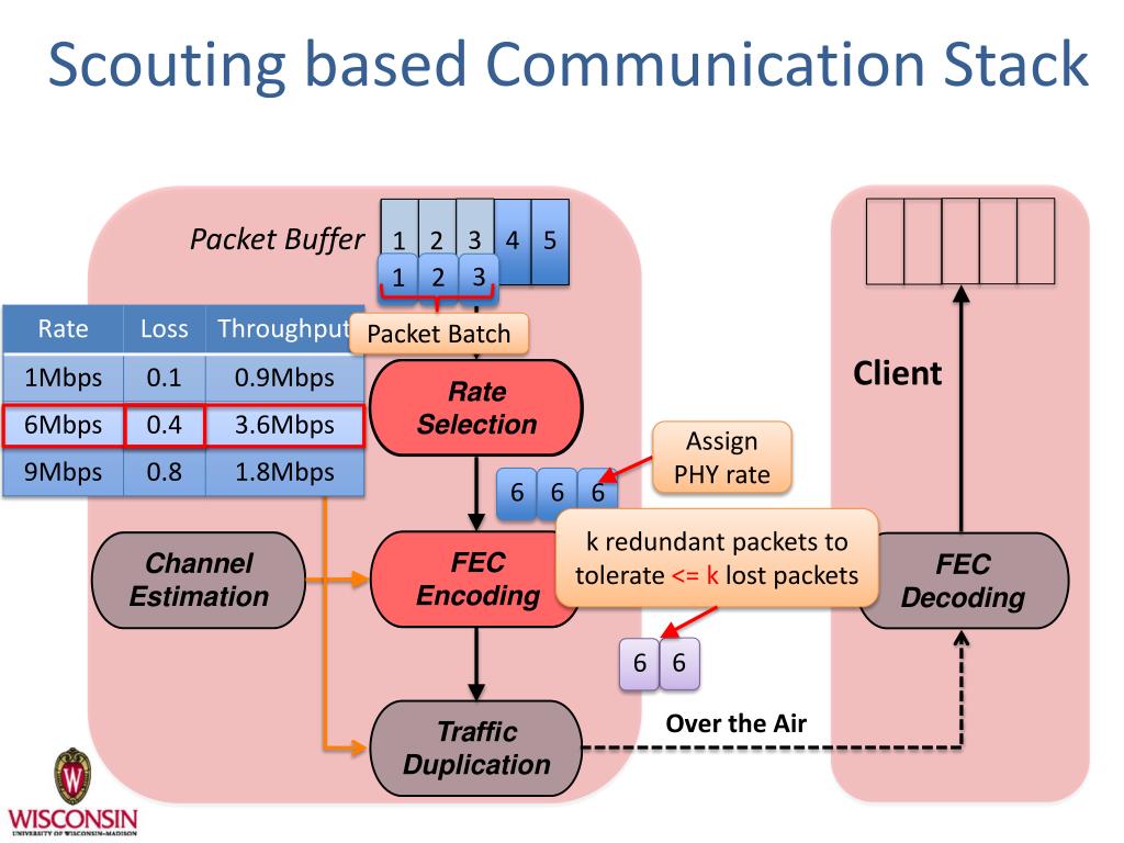 Scouting based Communication Stack Packet Buffer 3 4 5 2 1 3 2 1 Packet Batch Client Base Station Assign PHY rate 6 6 6 k redundant packets to tolerate <= k lost packets 6 6 Over the Air