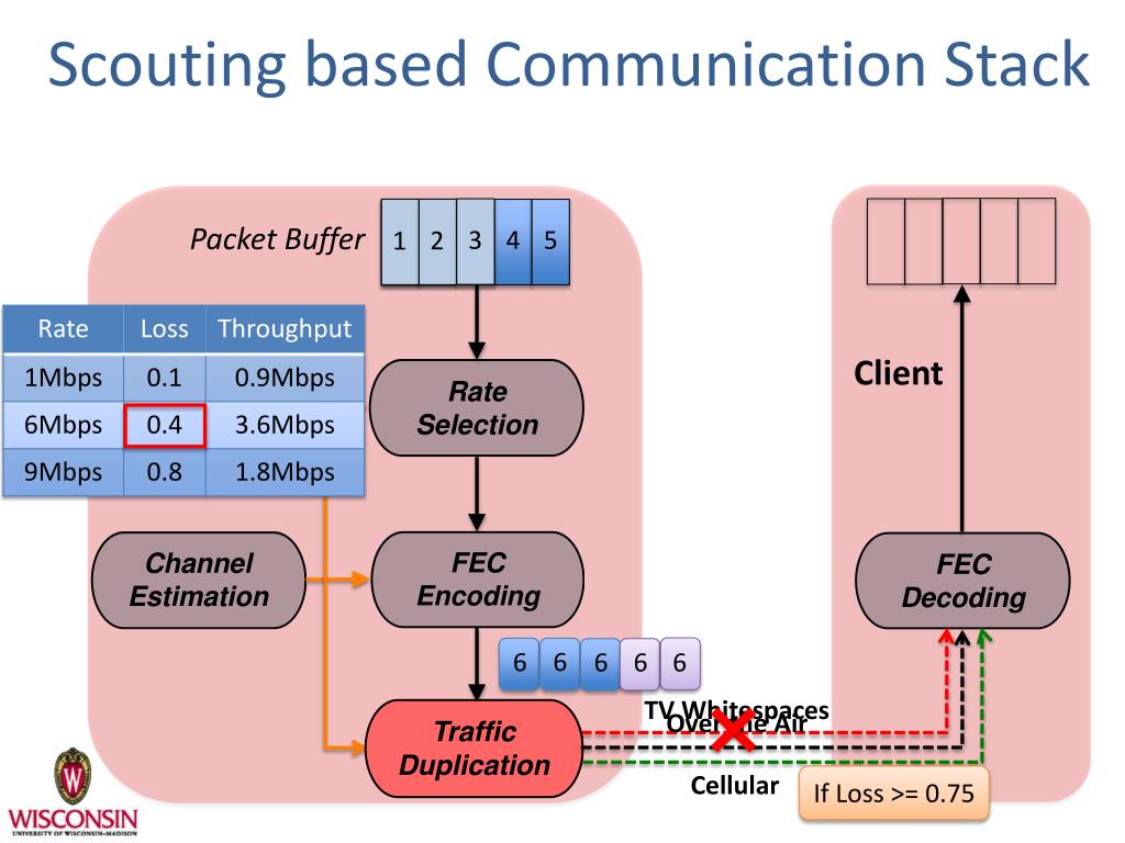 Scouting based Communication Stack Packet Buffer 3 4 5 2 1 Client Base Station 6 6 6 6 6 TV Whitespaces Over the Air Cellular If Loss >= 0.75
