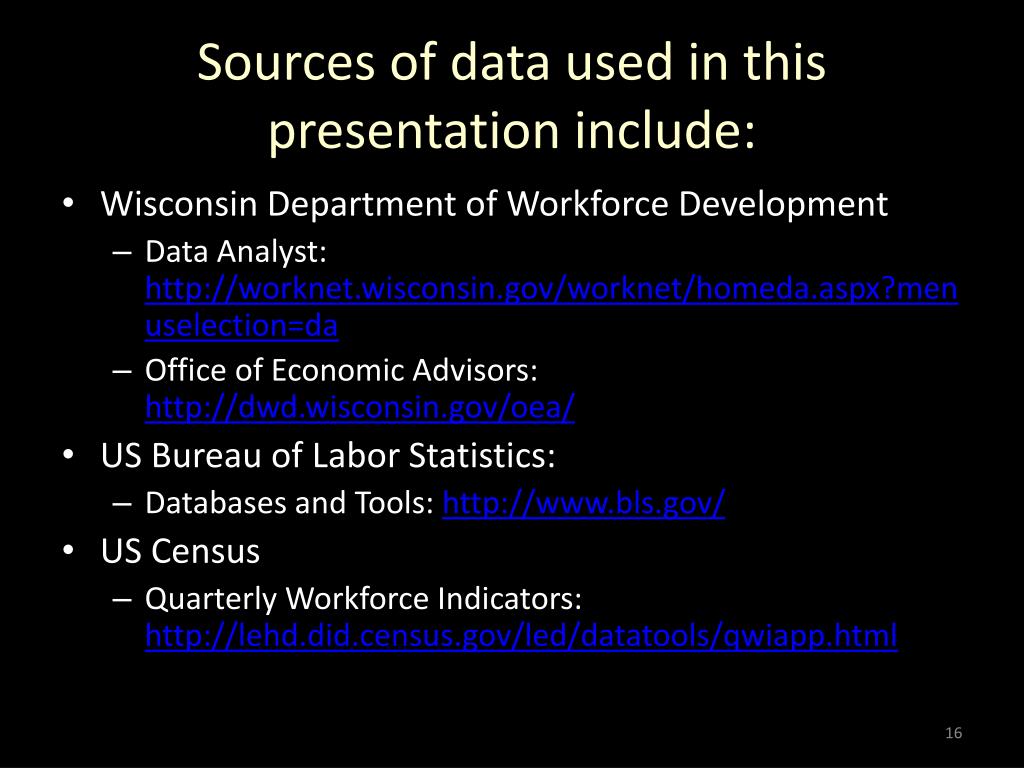 Sources of data used in this presentation include: • Wisconsin Department of Workforce Development • Data Analyst: http://worknet.wisconsin.gov/worknet/homeda.aspx?menuselection=da • Office of Economic Advisors: http://dwd.wisconsin.gov/oea/ • US Bureau of Labor Statistics: • Databases and Tools: http://www.bls.gov/ • US Census • Quarterly Workforce Indicators: http://lehd.did.census.gov/led/datatools/qwiapp.html