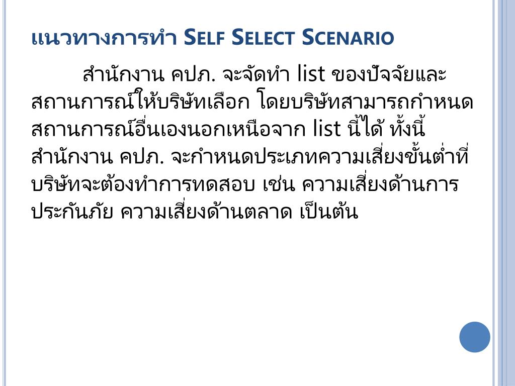 แนวทางการทำ Self Select Scenario สำนักงาน คปภ. จะจัดทำ list ของปัจจัยและสถานการณ์ให้บริษัทเลือก โดยบริษัทสามารถกำหนดสถานการณ์อื่นเองนอกเหนือจาก list นี้ได้ ทั้งนี้สำนักงาน คปภ. จะกำหนดประเภทความเสี่ยงขั้นต่ำที่บริษัทจะต้องทำการทดสอบ เช่น ความเสี่ยงด้านการประกันภัย ความเสี่ยงด้านตลาด เป็นต้น