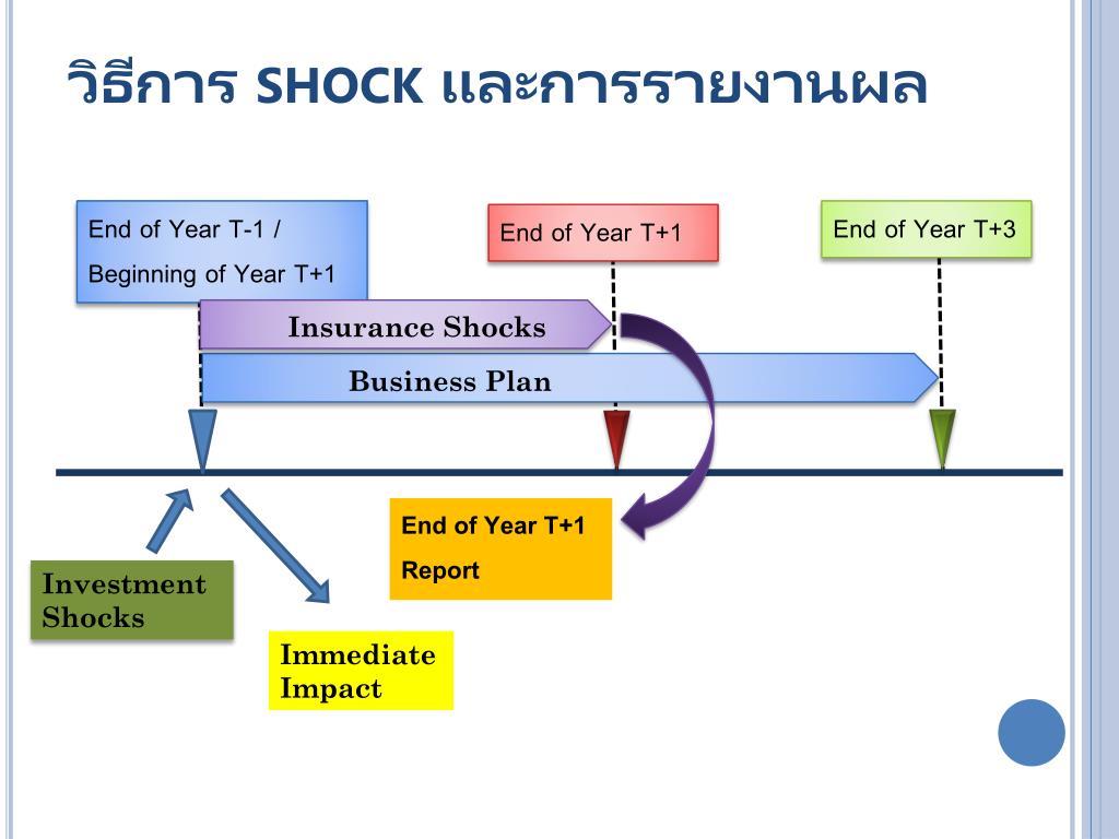 วิธีการ shock และการรายงานผล End of Year T-1 / Beginning of Year T+1 End of Year T+3 End of Year T+1 Insurance Shocks Business Plan End of Year T+1 Report Investment Shocks Immediate Impact