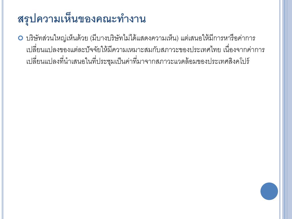สรุปความเห็นของคณะทำงานสรุปความเห็นของคณะทำงาน • บริษัทส่วนใหญ่เห็นด้วย (มีบางบริษัทไม่ได้แสดงความเห็น) แต่เสนอให้มีการหารือค่าการเปลี่ยนแปลงของแต่ละปัจจัยให้มีความเหมาะสมกับสภาวะของประเทศไทย เนื่องจากค่าการเปลี่ยนแปลงที่นำเสนอในที่ประชุมเป็นค่าที่มาจากสภาวะแวดล้อมของประเทศสิงคโปร์