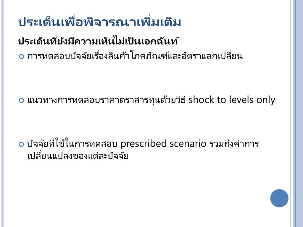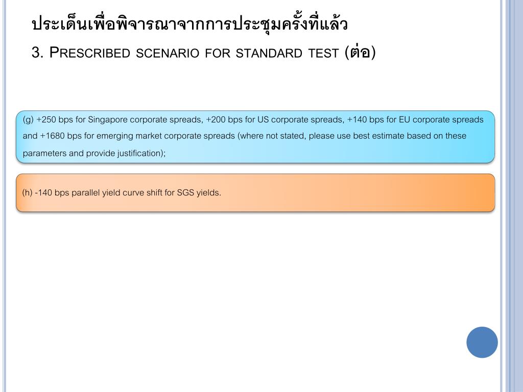 ประเด็นเพื่อพิจารณาเพิ่มเติมประเด็นเพื่อพิจารณาเพิ่มเติม ประเด็นที่ยังมีความเห็นไม่เป็นเอกฉันท์ • การทดสอบปัจจัยเรื่องสินค้าโภคภัณฑ์และอัตราแลกเปลี่ยน • แนวทางการทดสอบราคาตราสารทุนด้วยวิธี shock to levels only • ปัจจัยที่ใช้ในการทดสอบ prescribed scenario รวมถึงค่าการเปลี่ยนแปลงของแต่ละปัจจัย