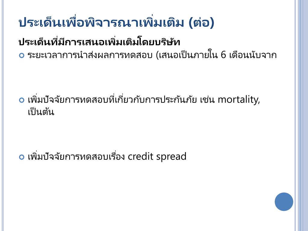 ประเด็นเพื่อพิจารณาเพิ่มเติม (ต่อ) ประเด็นที่มีการเสนอเพิ่มเติมโดยบริษัท • ระยะเวลาการนำส่งผลการทดสอบ (เสนอเป็นภายใน 6 เดือนนับจากสิ้นปีปฏิทิน) • เพิ่มปัจจัยการทดสอบที่เกี่ยวกับการประกันภัย เช่น mortality, morbidity, lapse, longevity เป็นต้น • เพิ่มปัจจัยการทดสอบเรื่อง credit spread