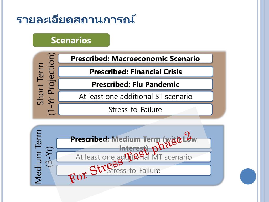 รายละเอียดสถานการณ์ Scenarios • Short Term • (1-Yr Projection) • Prescribed: Macroeconomic Scenario • Prescribed: Financial Crisis • Prescribed: Flu Pandemic • At least one additional ST scenario Stress-to-Failure • Medium Term • (3-Yr) For Stress Test phase 2 • Prescribed: Medium Term (with Low Interest) • At least one additional MT scenario Stress-to-Failure