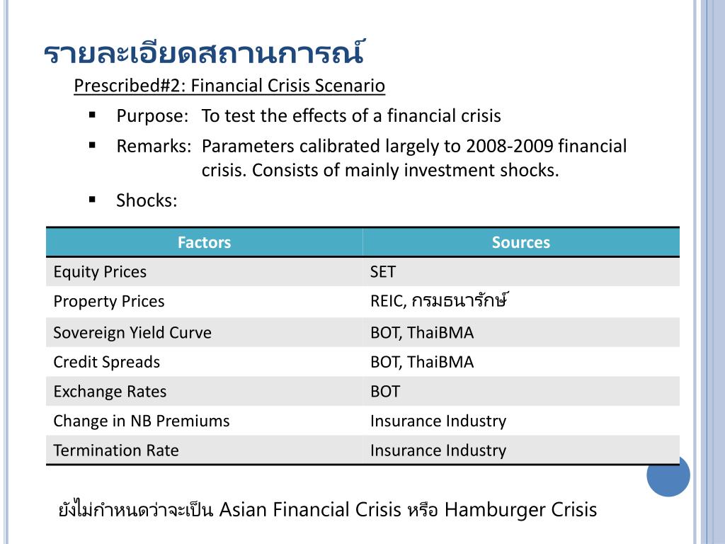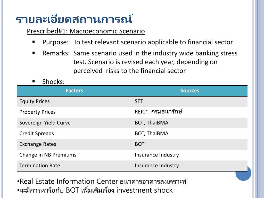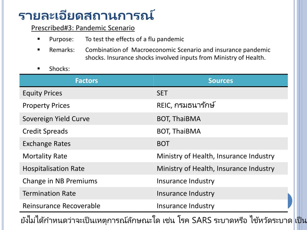 รายละเอียดสถานการณ์ • Prescribed#3: Pandemic Scenario • Purpose: To test the effects of a flu pandemic • Remarks: Combination of Macroeconomic Scenario and insurance pandemic shocks. Insurance shocks involved inputs from Ministry of Health. • Shocks: ยังไม่ได้กำหนดว่าจะเป็นเหตุการณ์ลักษณะใด เช่น โรค SARS ระบาดหรือ ไข้หวัดระบาด เป็นต้น