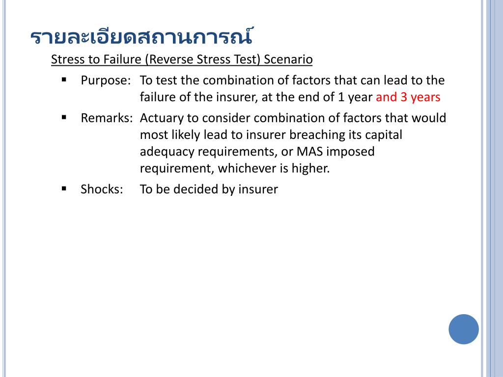 รายละเอียดสถานการณ์ • Stress to Failure (Reverse Stress Test) Scenario • Purpose: To test the combination of factors that can lead to the failure of the insurer, at the end of 1 year and 3 years • Remarks: Actuary to consider combination of factors that would most likely lead to insurer breaching its capital adequacy requirements, or MAS imposed requirement, whichever is higher. • Shocks: To be decided by insurer