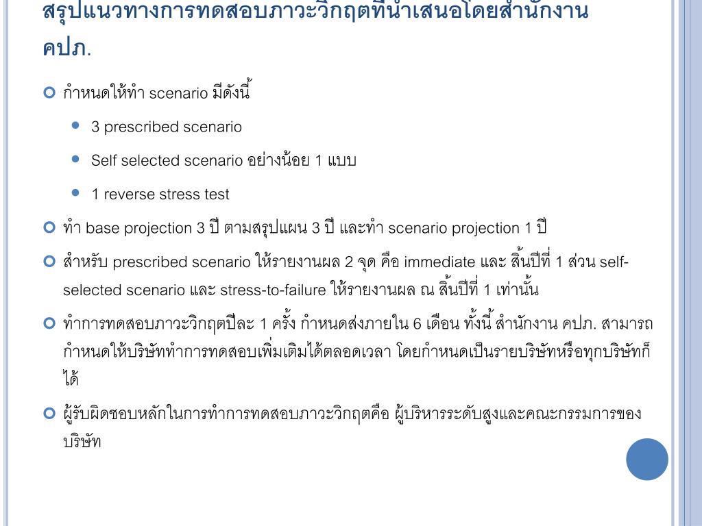 สรุปแนวทางการทดสอบภาวะวิกฤตที่นำเสนอโดยสำนักงาน คปภ. • กำหนดให้ทำ scenario มีดังนี้ • 3 prescribed scenario • Self selected scenario อย่างน้อย 1 แบบ • 1 reverse stress test • ทำ base projection 3 ปี ตามสรุปแผน 3 ปี และทำ scenario projection 1 ปี • สำหรับ prescribed scenario ให้รายงานผล 2 จุด คือ immediate และ สิ้นปีที่ 1 ส่วน self-selected scenario และ stress-to-failure ให้รายงานผล ณ สิ้นปีที่ 1 เท่านั้น • ทำการทดสอบภาวะวิกฤตปีละ 1 ครั้ง กำหนดส่งภายใน 6 เดือน ทั้งนี้ สำนักงาน คปภ. สามารถกำหนดให้บริษัททำการทดสอบเพิ่มเติมได้ตลอดเวลา โดยกำหนดเป็นรายบริษัทหรือทุกบริษัทก็ได้ • ผู้รับผิดชอบหลักในการทำการทดสอบภาวะวิกฤตคือ ผู้บริหารระดับสูงและคณะกรรมการของบริษัท