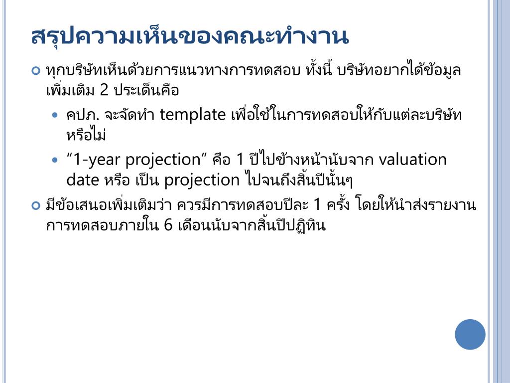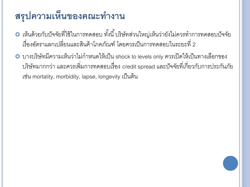 สรุปความเห็นของคณะทำงานสรุปความเห็นของคณะทำงาน • ทุกบริษัทเห็นด้วยการแนวทางการทดสอบ ทั้งนี้ บริษัทอยากได้ข้อมูลเพิ่มเติม 2 ประเด็นคือ • คปภ. จะจัดทำ template เพื่อใช้ในการทดสอบให้กับแต่ละบริษัทหรือไม่ • “1-year projection” คือ 1 ปีไปข้างหน้านับจาก valuation date หรือ เป็น projection ไปจนถึงสิ้นปีนั้นๆ • มีข้อเสนอเพิ่มเติมว่า ควรมีการทดสอบปีละ 1 ครั้ง โดยให้นำส่งรายงานการทดสอบภายใน 6 เดือนนับจากสิ้นปีปฏิทิน