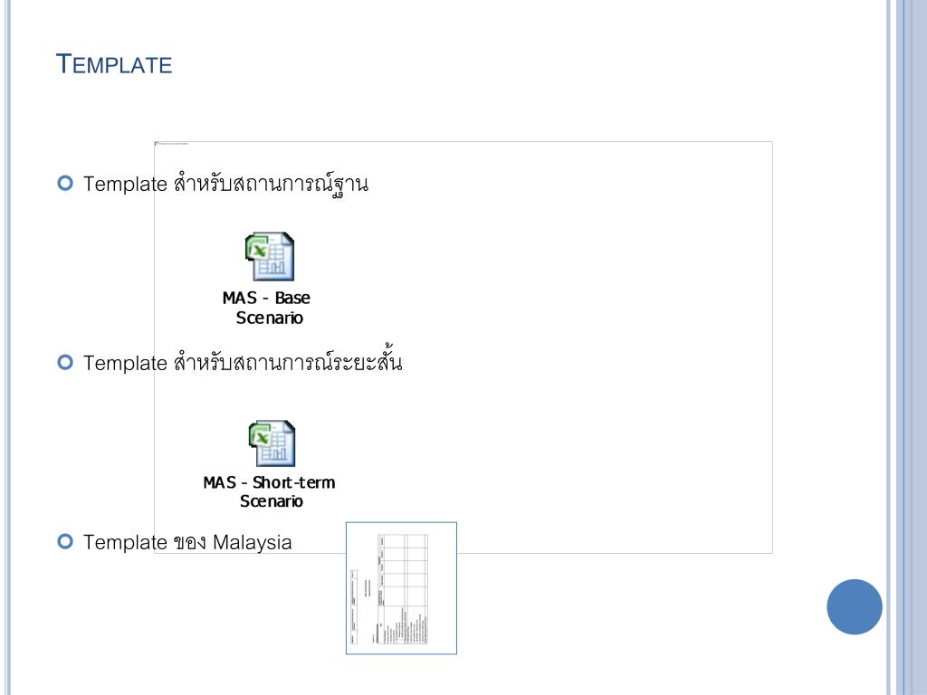 Template • Template สำหรับสถานการณ์ฐาน • Template สำหรับสถานการณ์ระยะสั้น • Template ของ Malaysia