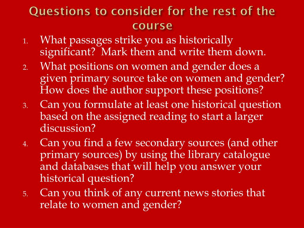 Questions to consider for the rest of the course • What passages strike you as historically significant? Mark them and write them down. • What positions on women and gender does a given primary source take on women and gender? How does the author support these positions? • Can you formulate at least one historical question based on the assigned reading to start a larger discussion? • Can you find a few secondary sources (and other primary sources) by using the library catalogue and databases that will help you answer your historical question? • Can you think of any current news stories that relate to women and gender?
