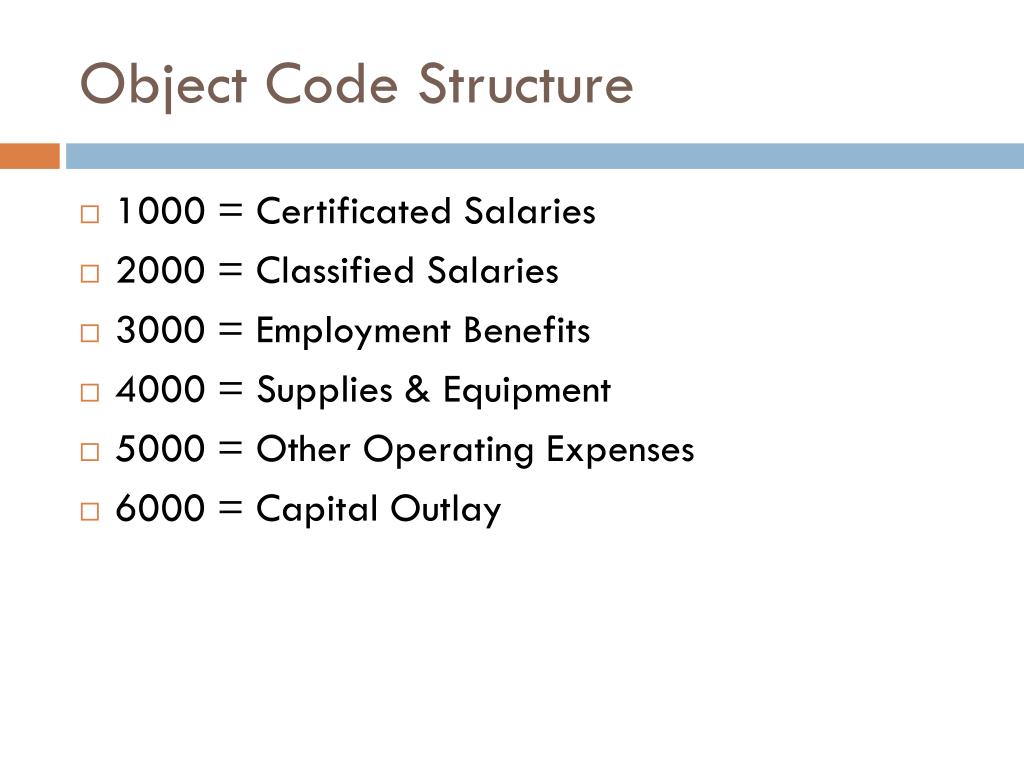 Object Code Structure • 1000 = Certificated Salaries • 2000 = Classified Salaries • 3000 = Employment Benefits • 4000 = Supplies & Equipment • 5000 = Other Operating Expenses • 6000 = Capital Outlay