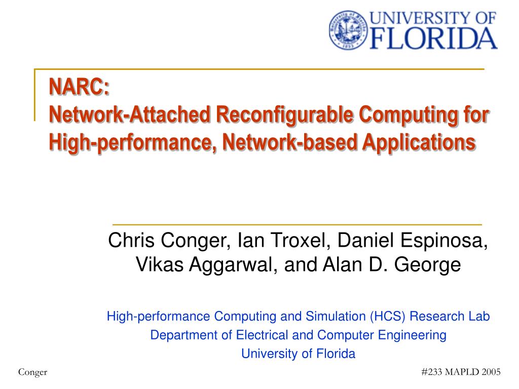NARC: Network-Attached Reconfigurable Computing for High-performance, Network-based Applications. Chris Conger, Ian Troxel, Daniel Espinosa, Vikas Aggarwal, and Alan D. George High-performance Computing and Simulation (HCS) Research Lab Department of Electrical and Computer Engineering
