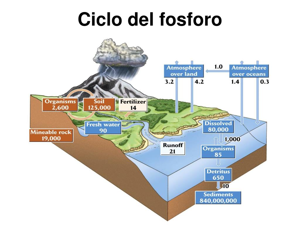 Ciclo del fosforo • Il fosforo è un elemento essenziale per la vita ed è presente negli acidi nucleici, nelle membrane cellulari, nei sistemi di trasferimento dell’energia, nelle ossa e nei denti • Il ciclo del fosforo è di tipo sedimentario • Il fosforo può limitare la produttività primaria: • negli ecosistemi acquatici, dove può essere intrappolato nei sedimenti per tempi molto lunghi • nei suoli, dove è prontamente disponibile solo per un pH leggermente acido (compreso fra 6 and 7)