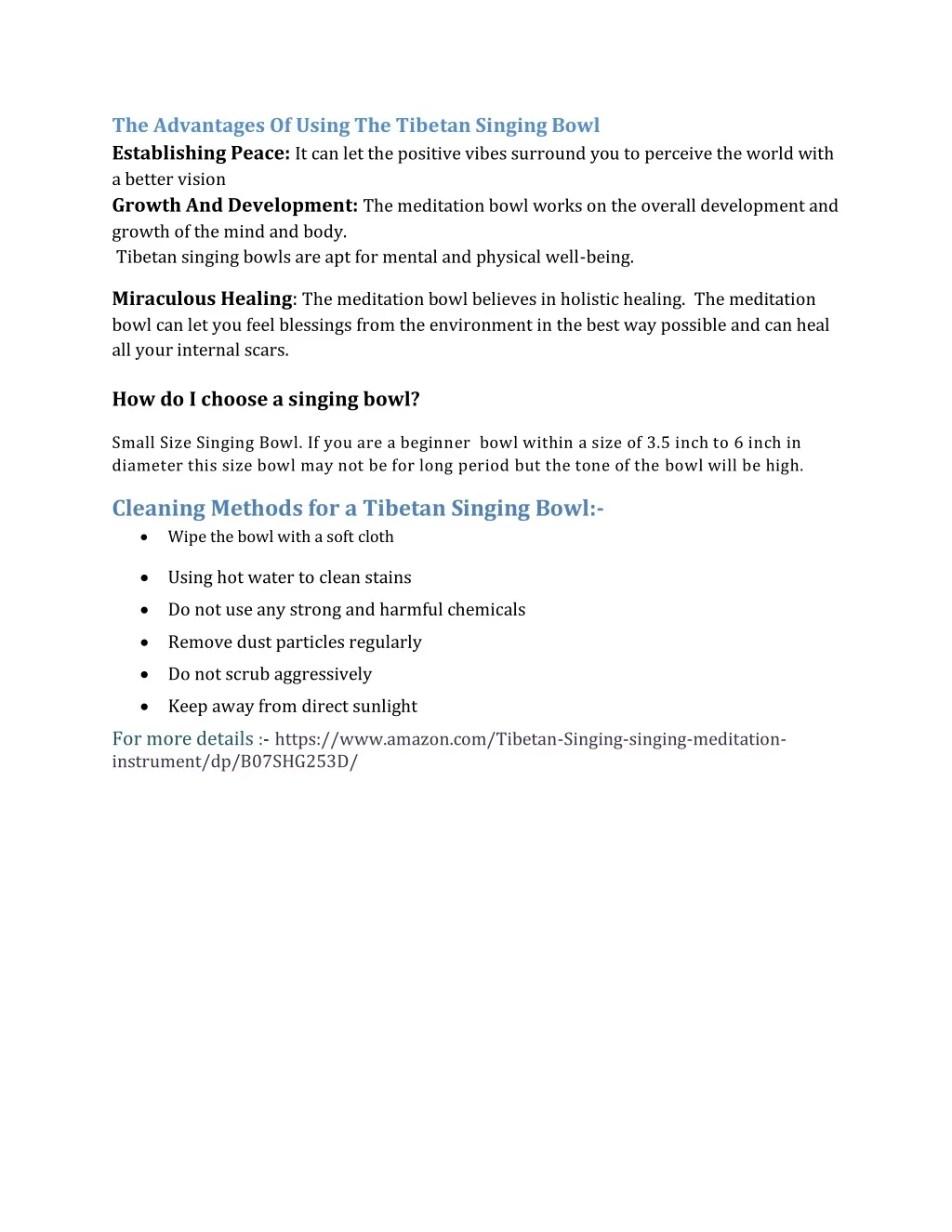 The Advantages Of Using The Tibetan Singing Bowl Establishing Peace: It can let the positive vibes surround you to perceive the world with a better vision Growth And Development: The meditation bowl works on the overall development and growth of the mind and body. Tibetan singing bowls are apt for mental and physical well-being. Miraculous Healing: The meditation bowl believes in holistic healing. The meditation bowl can let you feel blessings from the environment in the best way possible and can heal all your internal scars. How do I choose a singing bowl? Small Size Singing Bowl. If you are a beginner bowl within a size of 3.5 inch to 6 inch in diameter this size bowl may not be for long period but the tone of the bowl will be high. Cleaning Methods for a Tibetan Singing Bowl:- Wipe the bowl with a soft cloth Using hot water to clean stains Do not use any strong and harmful chemicals Remove dust particles regularly Do not scrub aggressively Keep away from direct sunlight For more details :-https://www.amazon.com/Tibetan-Singing-singing-meditation- instrument/dp/B07SHG253D/