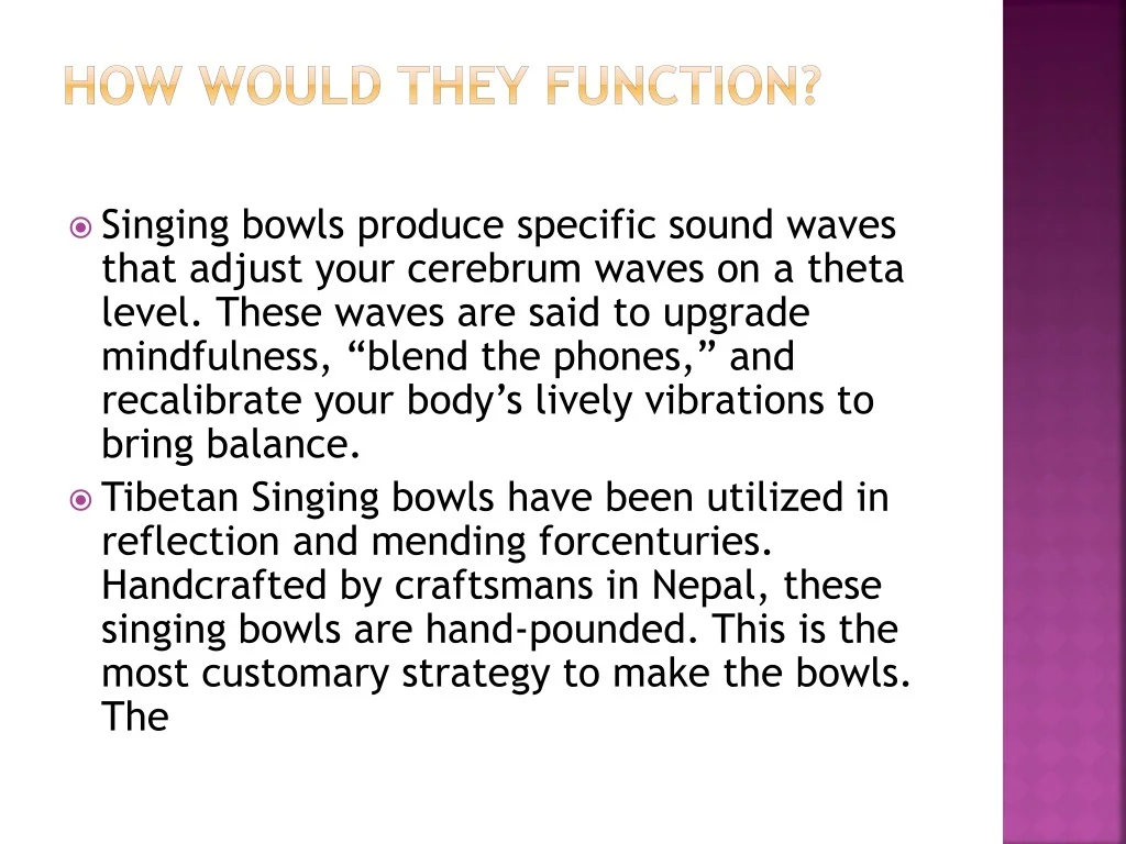How would they function? • Singing bowls produce specific sound waves that adjust your cerebrum waves on a theta level. These waves are said to upgrade mindfulness, “blend the phones,” and recalibrate your body’s lively vibrations to bring balance. • Tibetan Singing bowls have been utilized in reflection and mending forcenturies. Handcrafted by craftsmans in Nepal, these singing bowls are hand-pounded. This is the most customary strategy to make the bowls. The