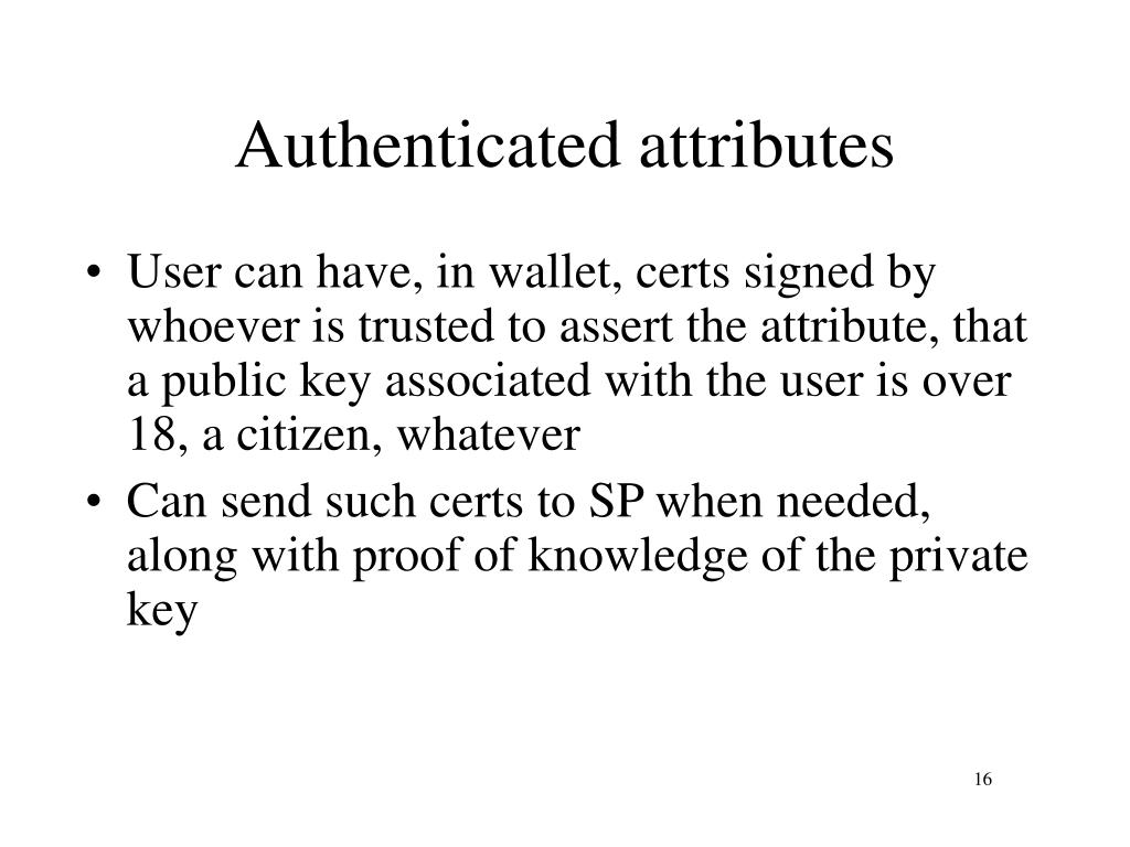Authenticated attributes • User can have, in wallet, certs signed by whoever is trusted to assert the attribute, that a public key associated with the user is over 18, a citizen, whatever • Can send such certs to SP when needed, along with proof of knowledge of the private key