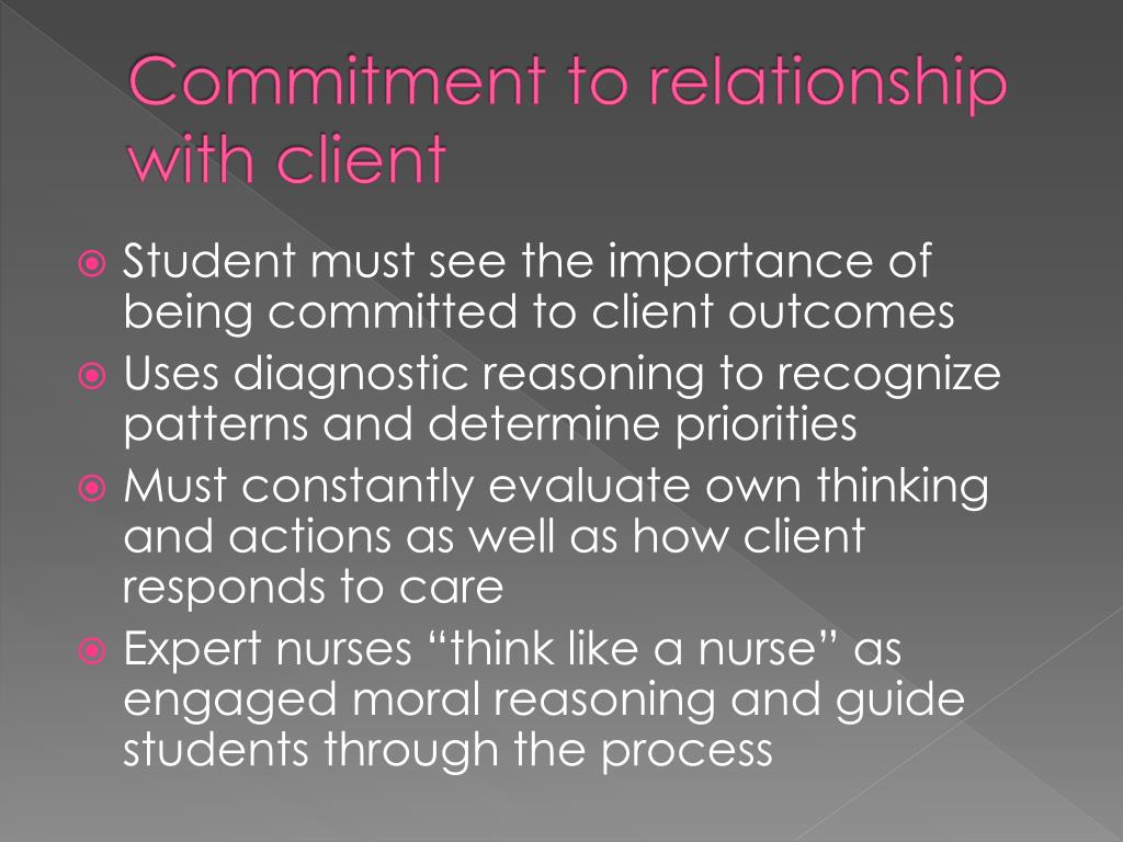 Commitment to relationship with client • Student must see the importance of being committed to client outcomes • Uses diagnostic reasoning to recognize patterns and determine priorities • Must constantly evaluate own thinking and actions as well as how client responds to care • Expert nurses “think like a nurse” as engaged moral reasoning and guide students through the process