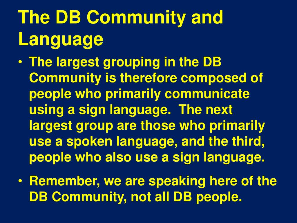 The DB Community and Language • The largest grouping in the DB Community is therefore composed of people who primarily communicate using a sign language. The next largest group are those who primarily use a spoken language, and the third, people who also use a sign language. • Remember, we are speaking here of the DB Community, not all DB people.