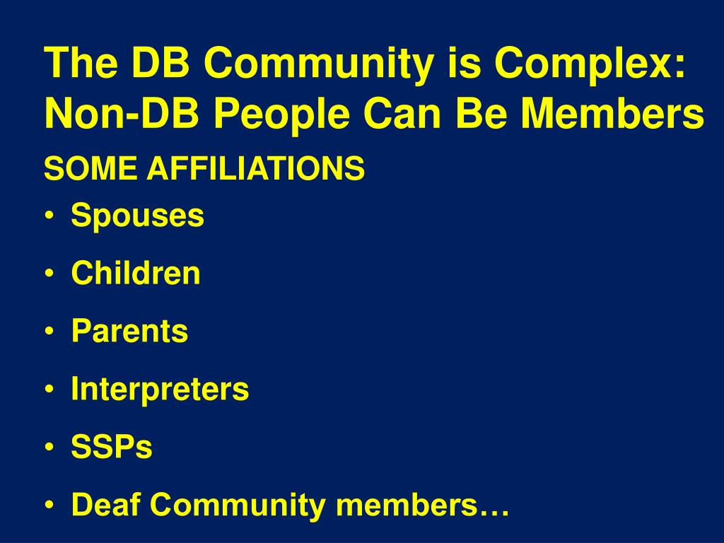 The DB Community is Complex: Non-DB People Can Be Members SOME AFFILIATIONS • Spouses • Children • Parents • Interpreters • SSPs • Deaf Community members…