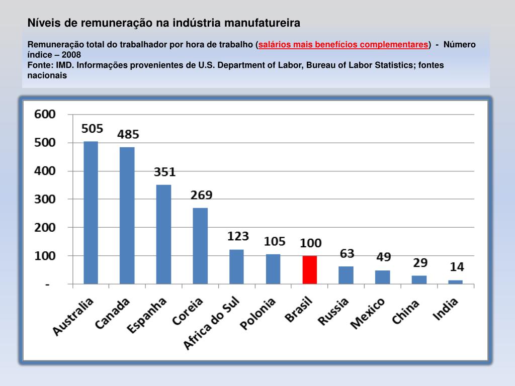 Níveis de remuneração na indústria manufatureiraRemuneração total do trabalhador por hora de trabalho (salários mais benefícios complementares) - Número índice – 2008Fonte: IMD. Informaçõesprovenientes de U.S. Department of Labor, Bureau of Labor Statistics; fontesnacionais