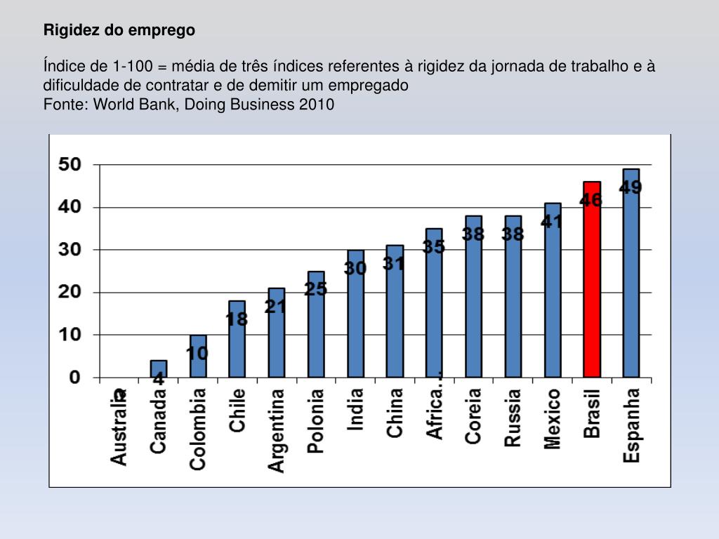 Rigidez do empregoÍndice de 1-100 = média de três índices referentes à rigidez da jornada de trabalho e à dificuldade de contratar e de demitir um empregadoFonte: World Bank, Doing Business 2010