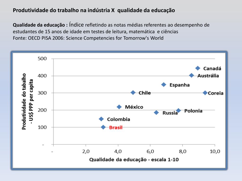 Produtividade do trabalho na indústria X qualidade da educaçãoQualidade da educação :Índicerefletindo as notas médias referentes ao desempenho de estudantes de 15 anos de idade em testes de leitura, matemática e ciênciasFonte: OECD PISA 2006: Science Competencies for Tomorrow's World
