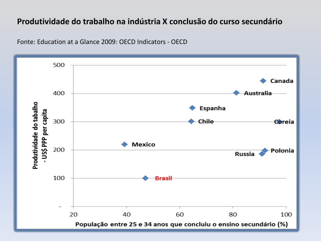 Produtividade do trabalho na indústria X conclusão do curso secundárioFonte: Education at a Glance 2009: OECD Indicators - OECD