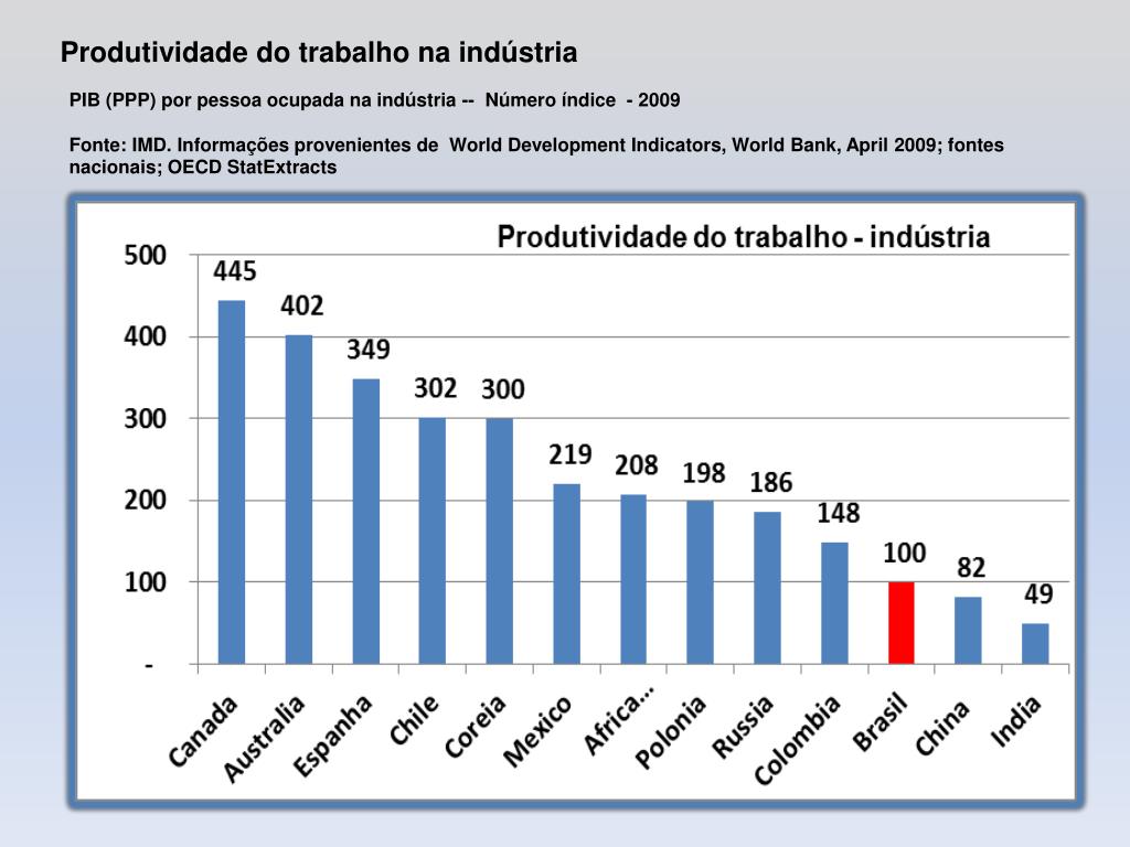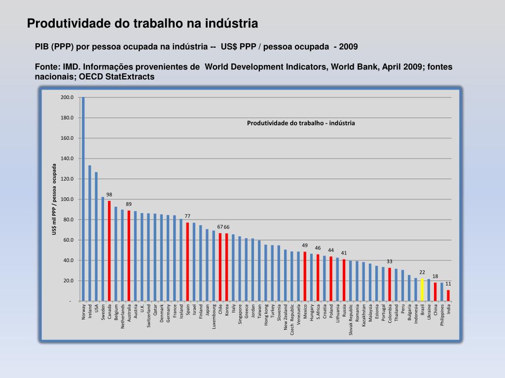 PIB (PPP) por pessoa ocupada na indústria -- Número índice - 2009Fonte: IMD. Informações provenientes de World Development Indicators, World Bank, April 2009; fontes nacionais; OECD StatExtracts Produtividade do trabalho na indústria
