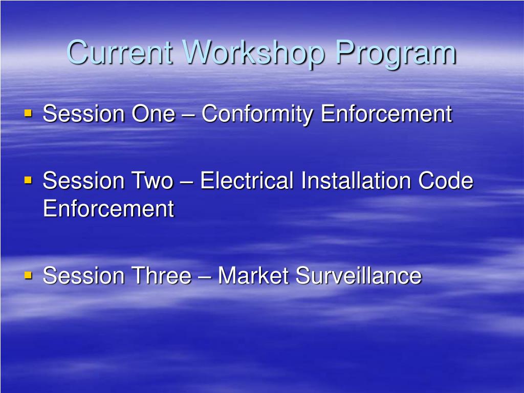 Current Workshop Program • Session One – Conformity Enforcement • Session Two – Electrical Installation Code Enforcement • Session Three – Market Surveillance