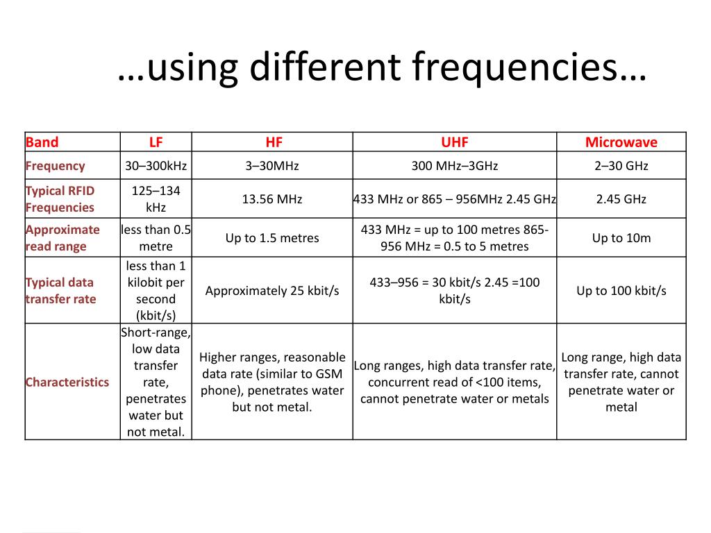 What it is Radio Frequency IDentification Data is stored on integrated circuits (called “chips”) Can be read and written many times over Data is “broadcast” via an aerial All attached to a “form factor”
