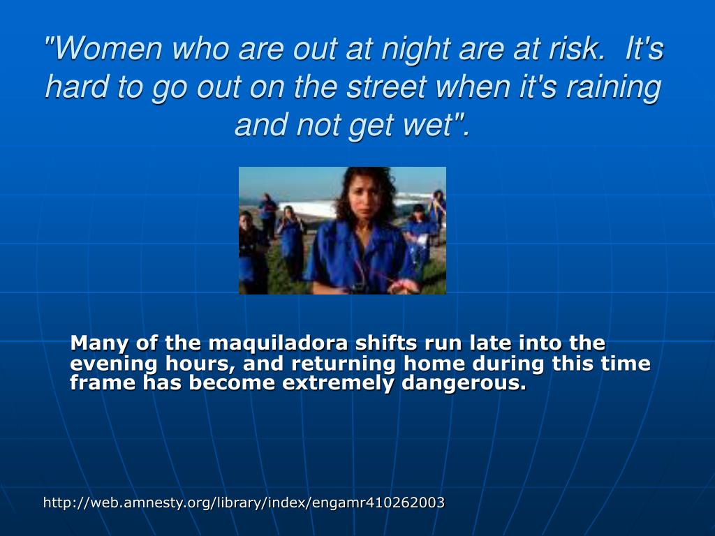 "Women who are out at night are at risk. It's hard to go out on the street when it's raining and not get wet". Many of the maquiladora shifts run late into the evening hours, and returning home during this time frame has become extremely dangerous. http://web.amnesty.org/library/index/engamr410262003